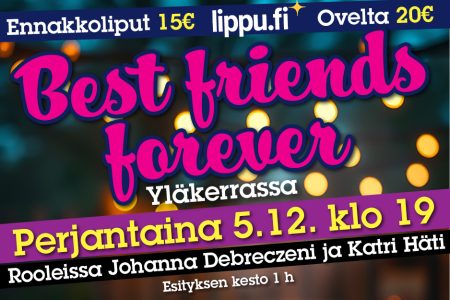 Best Friends Forever on tarina kahden entisen ystävän kohtaamisesta. Facebook on tuonut suurperheen äiti Annun ja urasinkku Minnan taas yhteen yli 20 vuoden tauon jälkeen. Kumpikaan ei ole varma, miksi heidän tiensä erkaantuivat. Arkikiireiden keskellä puidaan menneisyyttä ja luodaan katse tulevaan, revitään auki vanhat haavat ja paljastetaan salaisimmat haaveet. Kukapa ei välillä joisi cavapulloa vartissa tai kantaisi kymmentä raskaustestiä käsilaukussaan? Kuinka monta miesystävää karkoittaa rutiinin pelon? Entä kuka on Pasi? Tämä esitys on sinulle, joka rakastat hyviä biisejä, etkä säikähdä roisia huumoria. Tule nauttimaan hersyvien naisten ja hyvän musiikin seuraan!